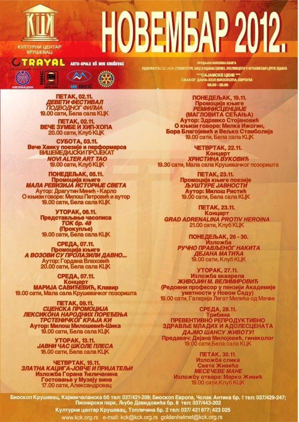 KulturaProgram KCK za novembar Autor: RTK01/11/2012 19:56 U Medija centru KCK predstavljen je program Kulturnog centra Kruševac za novembar 2012. godine.