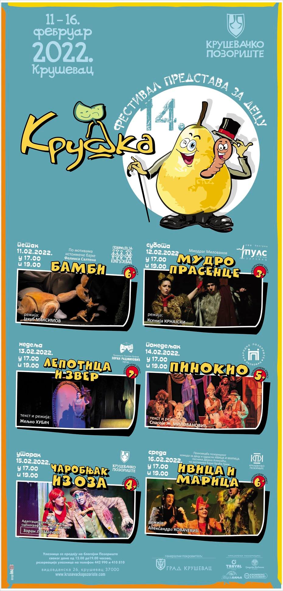 U Kruševačkom pozorištu danas počinje 14. revijalni Festival predstava za decu “Kruška” koji će otvoriti predstava “Bambi” u izvođenju glumaca Kragujevačkog pozorišta.