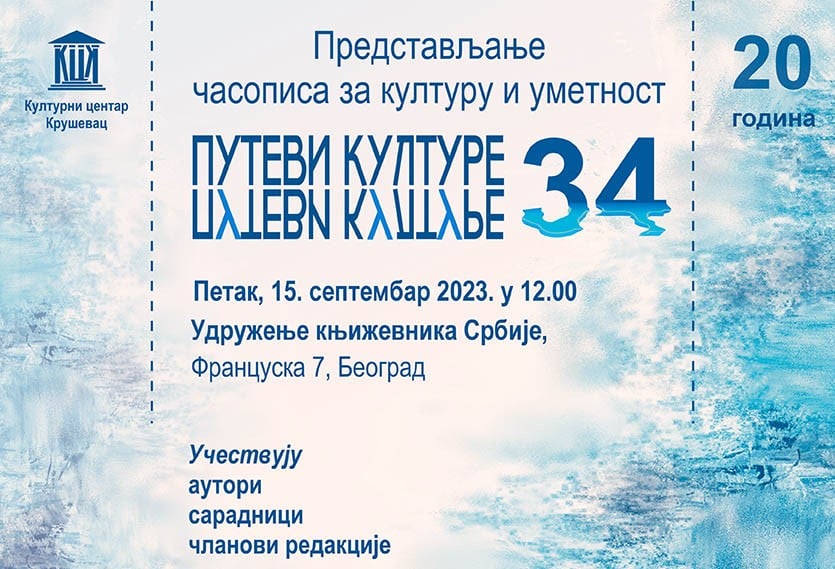 U petak, 15. septembra, u Udruženju književnika Srbije u Beogradu, biće predstavljen 34. broj časopisa za kulturu i umetnost, Putevi kulture, u izdanju Kulurnog centra Kruševac.