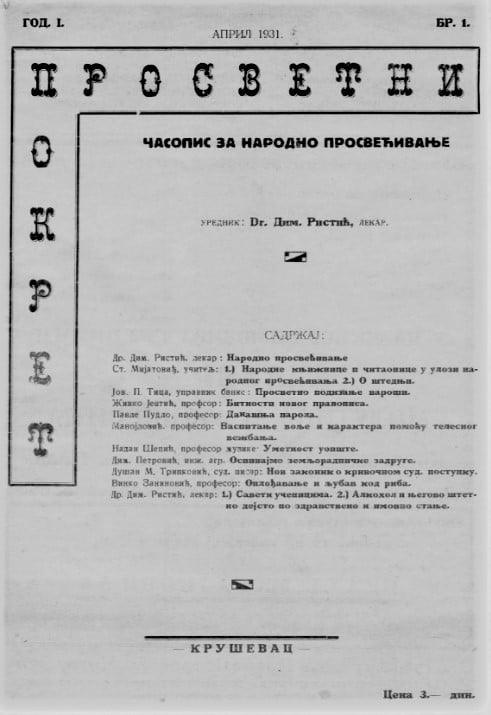 Kruševački intelektualci izdaju “Prosvetni pokret” (1931, 1932), “časopis za narodno prosvećivanje odraslih”, kao i književni časopis “Krug” (1930).