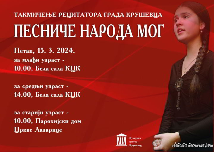 U organizaciji Kulturnog centra Kruševac, sutra je od 10 do 14 časova Takmičenje recitatora grada Kruševca.